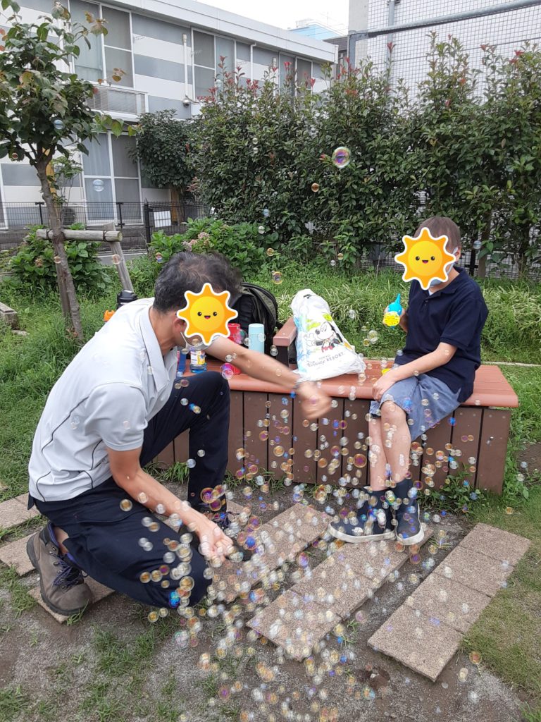 シャボン玉で遊ぼう!! 今の時代は、電動のシャボン玉機があるのです。プチっと押すだけで、た~くさんのシャボン玉が出来ちゃう。「キレイ~」と眺める子も居たり、無我夢中で『これでもか!』ってくらい連打しちゃう子。皆でシャボン玉機の取り合いに。そんな中、「貸して」「いいよ」の声が聞こえるじゃないですか。ステキ~♪♪ふくふくの子供たちは優しい子がたくさん居ます!
