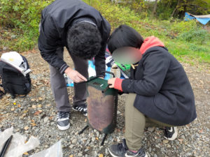コンロの組立が終わったら、火起こしとお芋の準備。