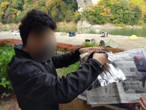 炭にも火が回ったら、銀紙で包んだお芋を直火焼き。濡れ新聞の中で、蒸し焼きにします。